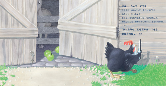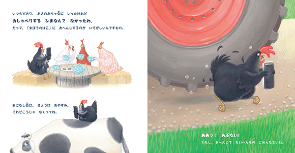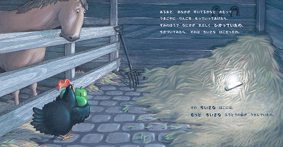 とても友達思いなにわとりが、ある日、不思議な光る箱をみつけます。