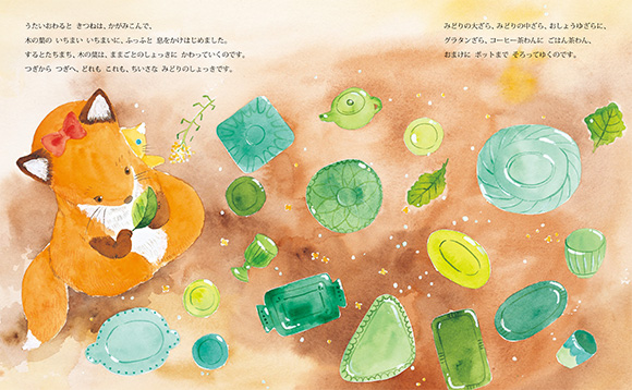 きつねの子は歌いながら、次から次へと葉っぱを緑の食器に変えていきます。