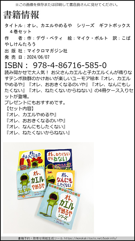 読み聞かせで大人気! お父さんカエルと子カエルくんが織りなすテンポ抜群のかけあいが楽しいユーモア絵本『オレ、カエルやめるや』『オレ、おおきくなるのいや』『オレ、なんにもしたくない』『オレ、ねたくないからねない』の4冊ケース入りセットが登場。