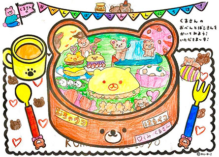 オムライスもハンバーガーもランチョンマットもくまさん。よく見ると旗の上やお弁当の中にも小さなくまさん達が!ハチミツと一緒に眠っていたりと細かいところまで自由で楽しいです♪可愛さ100点満点です!!