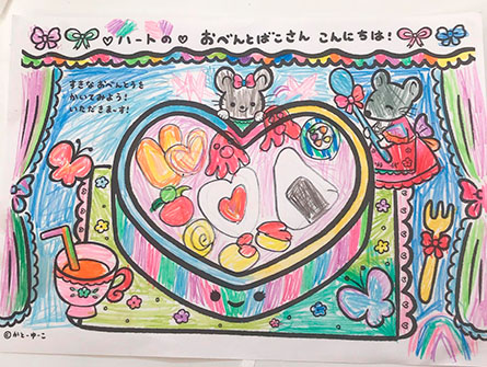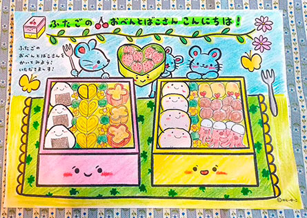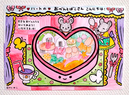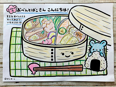 大好物がたくさん詰まったおべんとばこさん。楽しい気持ちで描いてくれたのが伝わってきて、見てる人までハッピーな気持ちになりますね! パッと目を引く色使いも素敵です。 ネズミさんのワンピースの色も可愛いですね!