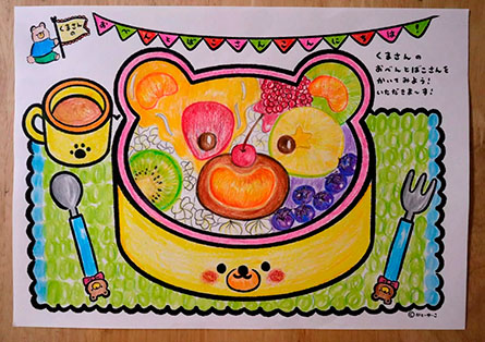コロンとした丸いタコさんウインナーや卵焼き、りんごの可愛さにワクワクしました!1つ1つの具たちが本当に愛らしいですね♪ カラフルな色もとてもおしゃれで、ほかにどんな絵を描く子なんだろうと、とても気になりました!