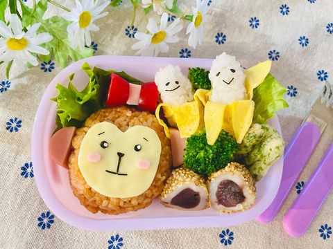 どうぶつたちがギュッと仲が良さそうでかわいいですね。 首の長いキリンさんの卵焼きがすごい!
