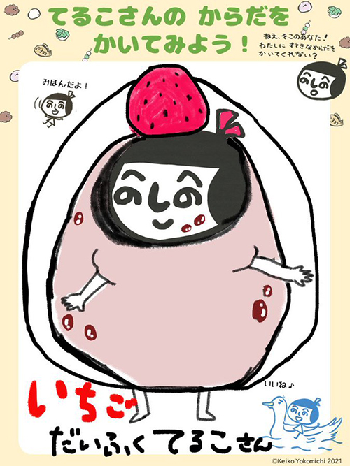 いちごだいふくのなかに、すっぽりくるまれてる てるこさんが、キュートでかわいいですね。 着ぐるみにできそう! おおきいいちごも、ほっぺのあんこも、つやつやでおいしそうです。