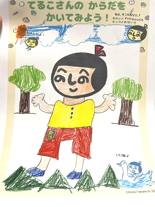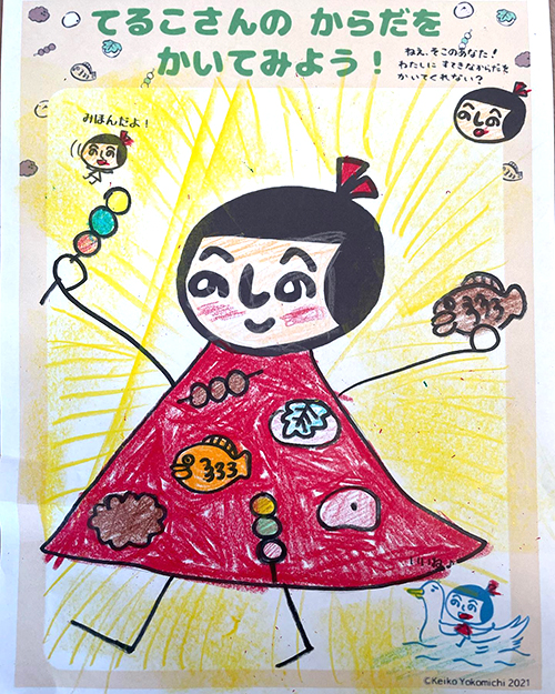 和菓子いっぱいのまっかなワンピースがステキなデザインですね! てるこさんのほっぺもほんのり赤くて照れてる感じで、てれてれてるこさんですね。 手に持っているおだんごもカラフルでおいしそう!何味かな?
